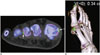 Similarly, synovial hemosiderin deposits can be identified on dual-energy CT in patients with pigmented villonodular synovitis (23). As in intravenously enhanced CT, VNC imaging may be applied to CT arthrography in the musculoskeletal region (23). In the musculoskeletal region, virtual non-calcium imaging may be used to evaluate the bone marrow that is beyond the scope of CT evaluation. Virtual non-calcium imaging subtracts calcium from cancellous bone and allows detection of acute traumatic bone marrow lesions including occult fractures and bone bruises, which cannot be clearly visualized on single-energy CT (23, 24, 25). Diagnostic performance of virtual non-calcium imaging tends to be better for small appendicular bones than axial skeletons. Adjustment of material decomposition ratio (r) is necessary for different tube voltage settings (1.45 for 80 and 140 kVp; 1.3 for 100 and 140 kVp) to eliminate bone mineral completely. Nevertheless, virtual non-calcium imaging is limited in evaluating bone marrow alterations close to the cortical bone or in sclerotic bone. In addition, false-positive results may occur due to the presence of normal red marrow, and other pathologies, such as osteonecrosis or degenerative changes, may mimic post-traumatic bone marrow lesions. A combined review of gray-scale images and color-coded images can facilitate the identification of small attenuation changes within the bone marrow (23, 24, 25). Of note, automatic color-coded bone marrow segmentation is incomplete, especially in the head region.