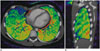 Effective atomic number (Zeff) and electron density (ρe) can be calculated from dual-energy CT data with small errors of 1.7 and 4.1%, respectively (16). Effective atomic number map is a quantitative approach in material differentiation by analyzing attenuation changes as a function of energy. CT number of water is zero irrespective of X-ray energy and likewise, Zeff of water is approximately 7.4–7.5. Of interest, lung perfusion defects caused by pulmonary embolism can be distinguished from the normally perfused lung more clearly on effective atomic number map than on iodine map (Fig. 7).